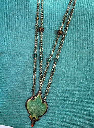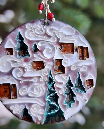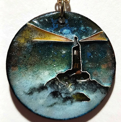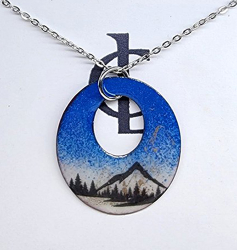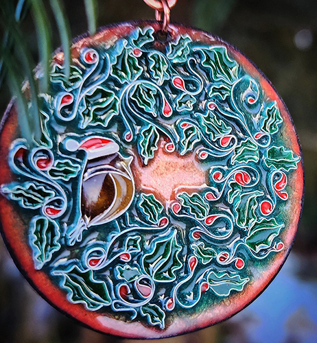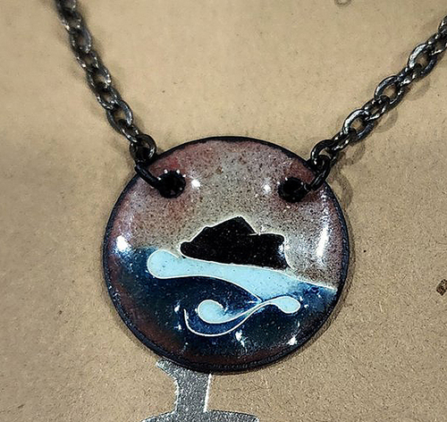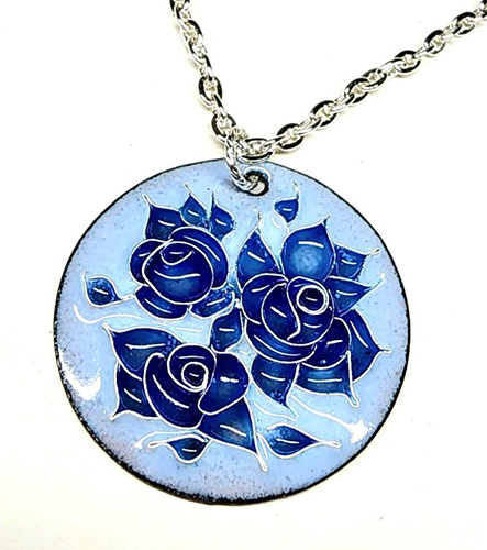 Enamel Statement: “Enameling is literally the fusing of two of my favorite materials, metal and glass. The rich color, depth, play of light and surfaces of enameling, as well as its ancient roots, grips my attention and provides endless possibilities. I use a wide range of enameling techniques, with a special focus on cloisonné–a process in which an image is developed by building cells defined with flat wire (I use copper and fine silver). These cells are filled with thin layers of kiln-fused glass.”