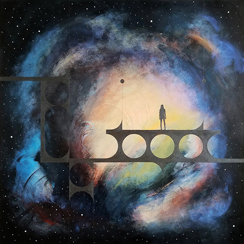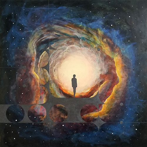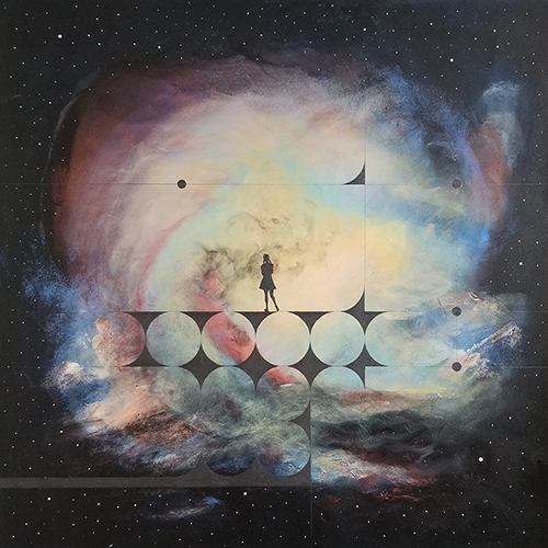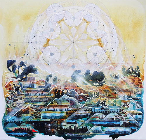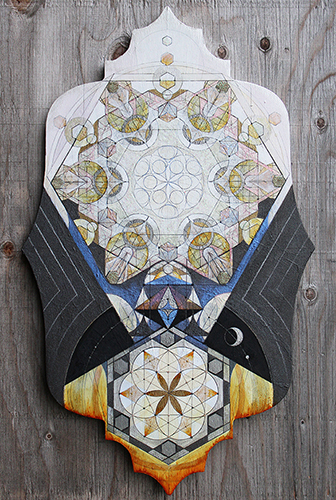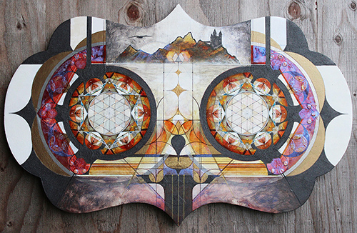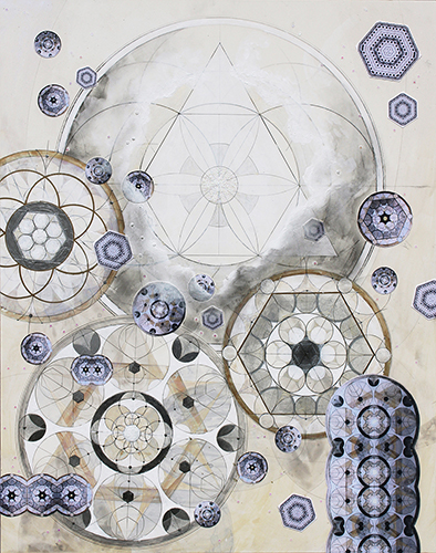 Mixed Media: “My mixed media technique incorporates acrylic paint, graphite, ink, and various found materials with my own manipulated photography (often using photographs of a work in progress, flipped, repeated, resized and printed back into the physical to use in the work), generous amounts of glitter, paper, and various found materials.”
