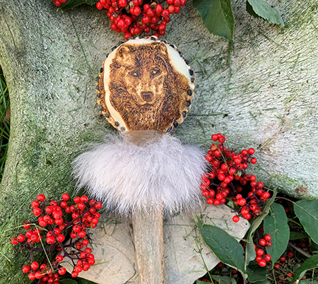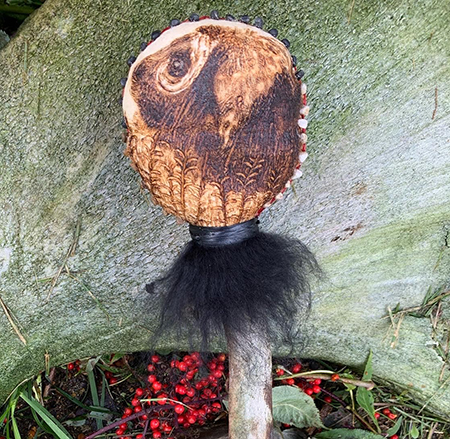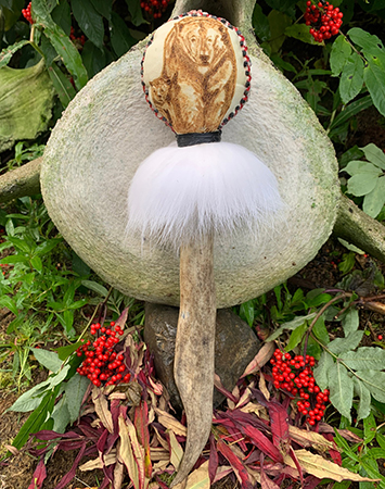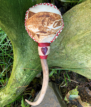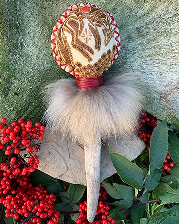 This desire to understand the rattle and its purpose subsequently resulted in the research of shamanism in Alaska. He quickly realized that few of these sacred tools remained and after making one, he has not looked back. Each rattle is unique and he harvests natural supplies whenever he can, responsibly and sustainably.